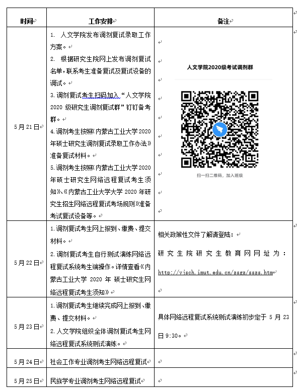 为做好我院硕士研究生招生调剂复试录取工作,确保我院研究生招生调剂复试录取工作安全平稳,根据教育部《2020年全国硕士研究生招生工作管理规定》(教学函〔20196号)、《关于做好2020年全国硕士研究生复试工作的通知》(教学厅〔20204号)和内蒙古自治区《关于做好我区2020年硕士研究生招生调剂复试录取工作的通知》(内教研函〔20206号)文件精神,结合疫情防控要求和我院招生工作实际情况制定本工作方案。