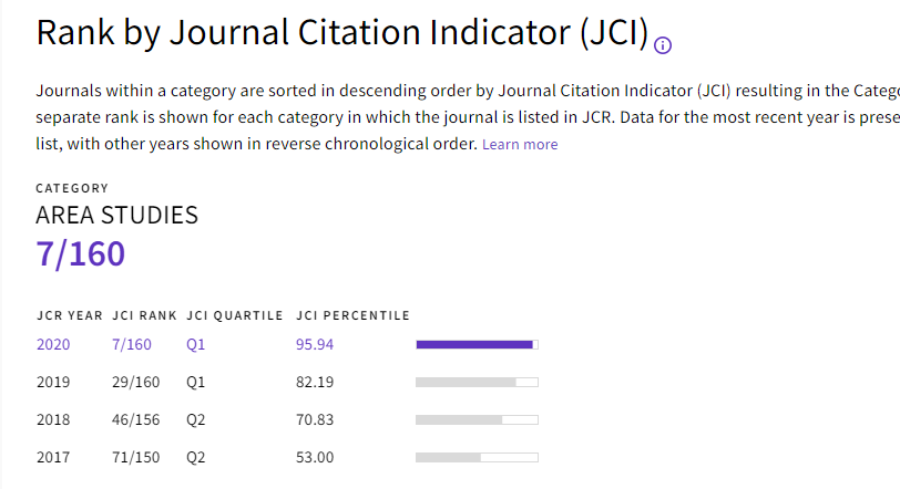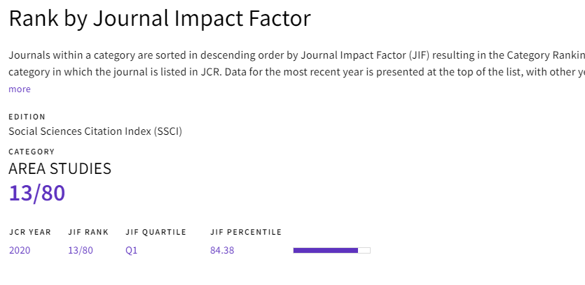 《Journal of Asian Public Policy》(JAPP)被收录于SSCI,在Journal Citation Reports(JCR)中显示最新的排名处于QI区(2020年),具体表现在前160个国际区域研究领域的期刊中的引用指标(JCI)排名第7处于Q1区,在前80个国际区域研究期刊影响因子(JIF)排名第13处于Q1区。