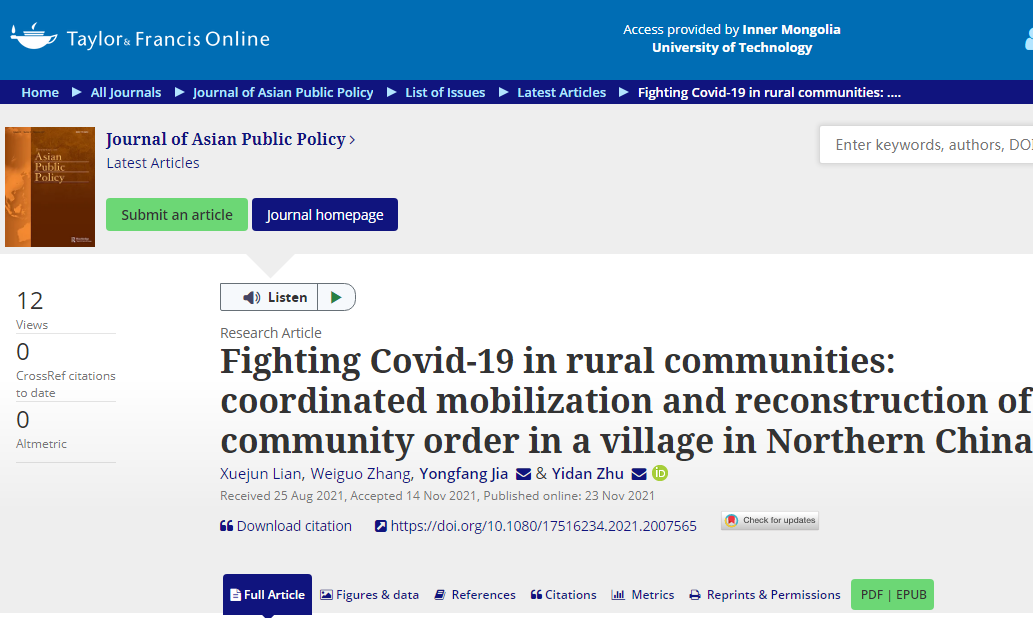 2021年11月23日,yl6776永利集团社会工作系连雪君副教授署名第一作者、贾永芳副教授联合署名通讯作者的文章:“Fighting Covid-19 in rural communities: coordinated mobilization and reconstruction of community order in a village in Northern China”在线发表在国际权威期刊《Journal of Asian Public Policy》(亚洲公共政策杂志)上,论文的作者还有加拿大多伦多大学张卫国副教授和共同通讯作者香港岭南大学朱一丹助理研究员。