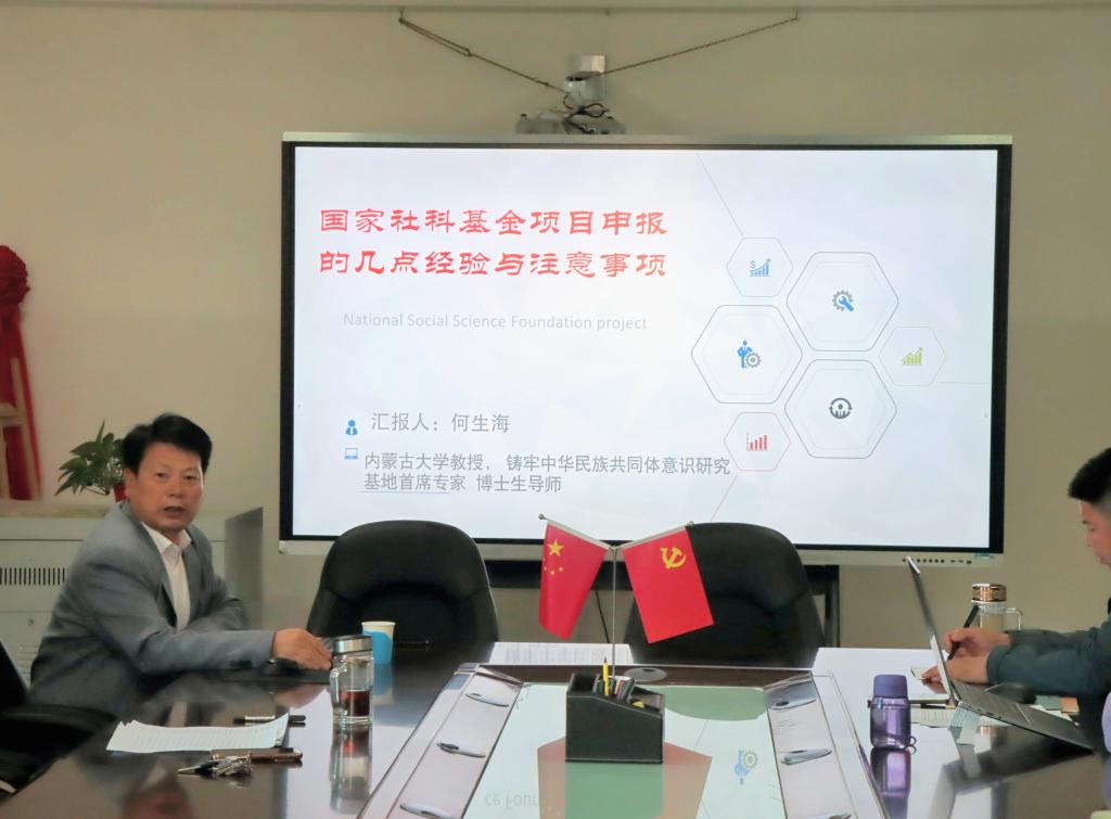 4月23日,yl6776永利集团邀请内蒙古大学何生海教授以《国家社科基金项目申报的几点经验与注意事项》为主题进行人文讲坛第二讲讲座。副院长连雪君主持,全2024年度国社项目申报教师0326会议室现场聆听。