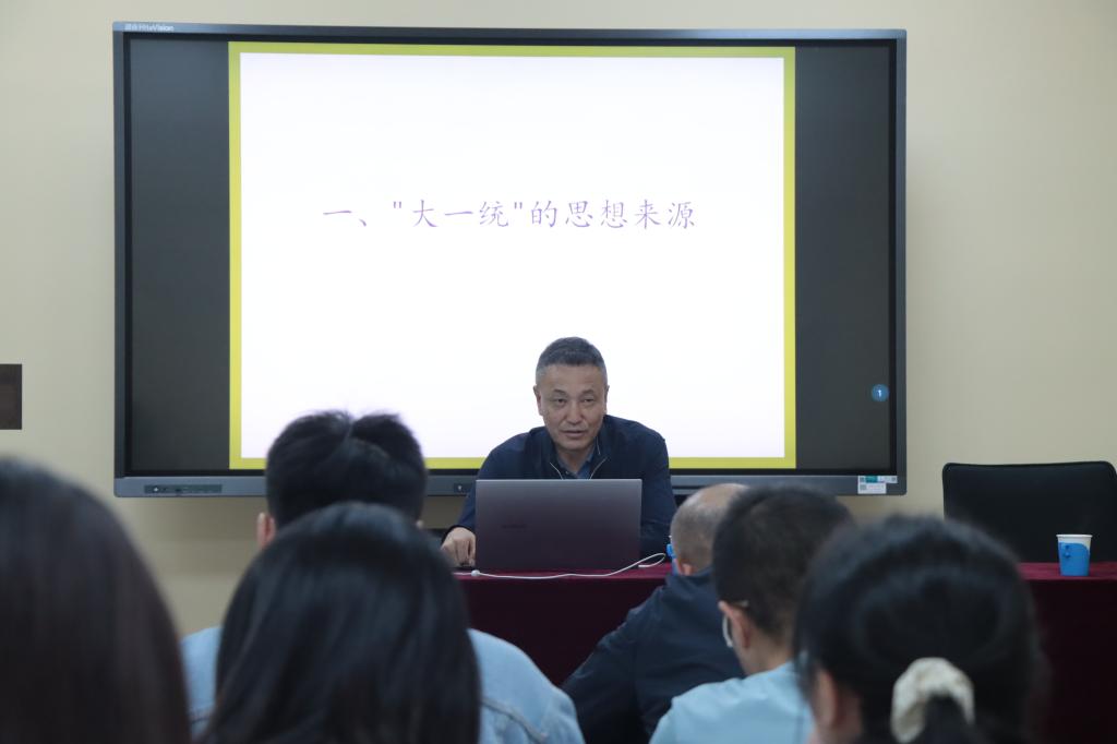黑龙教授是大连民族大学中华民族共同体研究院二级教授,大连民族大学中华民族共同体历史研究所所长。黑龙教授以《中国大一统的历史进程与大一统的思想内涵》为题,通过阐述“大一统”的思想来源历史进程思想内涵及历史意义,深度解释作为中华民族文化内核与精神灵魂的“大一统”思想并指出“大一统”思想的历史局限性。后黑龙教授与师生进行交流互动,一一讲解师生的问题。