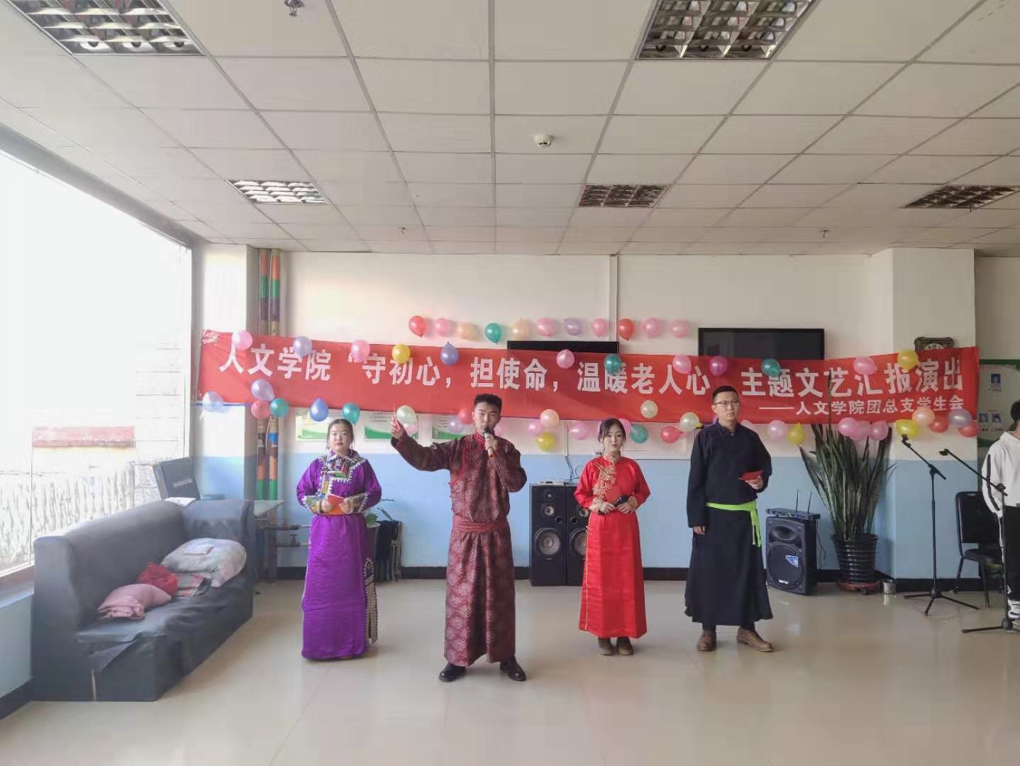 活动开始前,志愿者给老人送上水果,并询问身体状况,老人亲切回应并在其陪伴下陆续落座。随后,演员们经过简单的准备后迅速投入到演出状态中。合唱《雕花的马鞍》、蒙语朗诵《故乡》等让老人们感受到了浓浓的民族气息;歌曲《如果爱忘了》、《岁月神偷》、《后来》获得热烈的掌声,将演出推向高潮。节目表演者们唱出了激情,舞出了快乐,为平日宁静的敬老院增添了欢快喜庆的色彩。