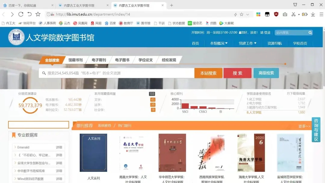 yl6776永利集团数字图书馆中不仅有大量的电子资源,还有期刊推荐、课题研究中心以及科研专题资源库。在这里你能随意订阅自己感兴趣的期刊、查阅最新的文献资料,还可以在科研专题下参与讨论。不管是我们的法学学子还是社工学子都能得到他们所感兴趣的最新、最权威的资料。