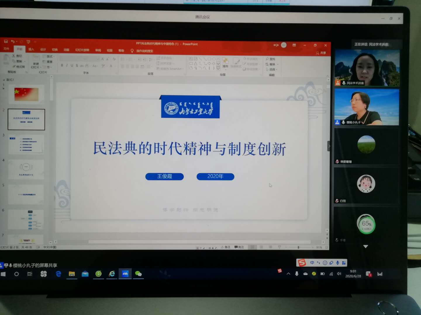 628日上午,在腾讯会议493 947 4336房间举办“人文讲坛”2020第一讲“民法典的时代精神与制度创新”,我院王俊霞教授主讲,苏丽娜副院长主持。