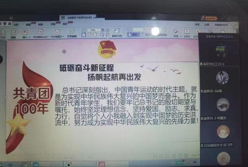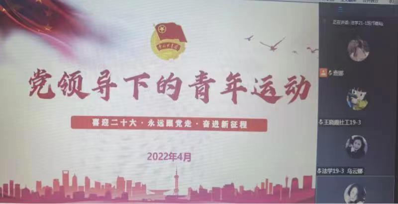 回望百年路,青春正当时。为深入学习贯彻习近平总书记关于引导青年发展重要思想和殷殷嘱托,重温党的青年运动百年历程,引领广大青年听党话、跟党走,庆祝中国共产主义青年团成立100周年,4月12日下午,yl6776永利集团团委组织各团支部书记线上开展党的青年运动史”专题学习会。
