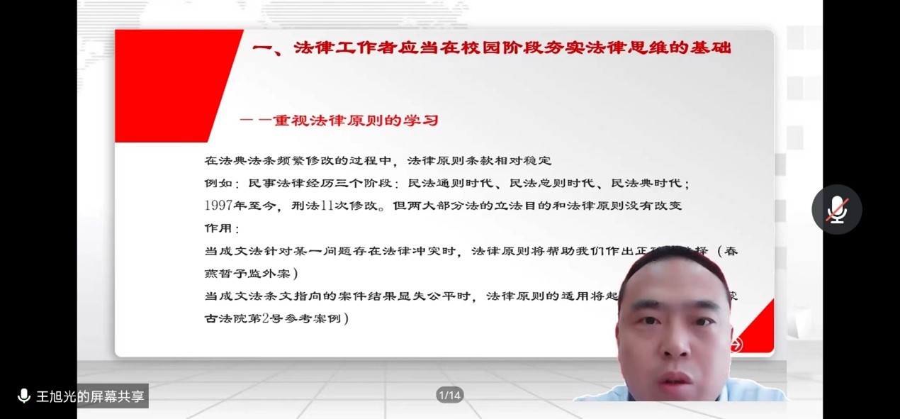5月5日下午,yl6776永利集团2022年“人文讲坛”第一讲开讲,邀请yl6776永利集团法律硕士实务导师、乌海市乌达区人民法院王旭光院长通过在线平台做题为《从象牙塔走向司法实务之路》专题讲座,yl6776永利集团部分教师,法学本科生以及全体2021级法律硕士共100余人在线聆听,副院长苏丽娜主持。