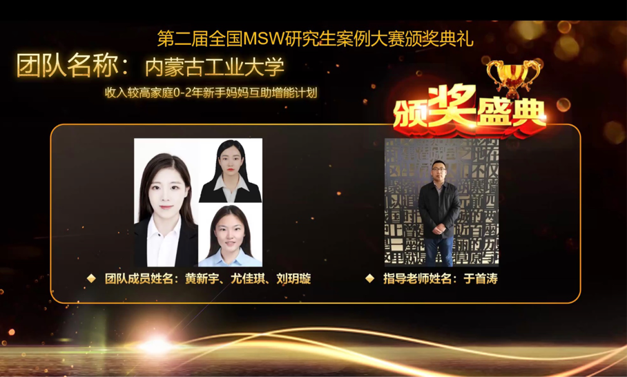 我院于首涛副教授指导的、见微书院梦之翼团队成员黄新宇、尤佳琪等同学负责的案例《收入较高家庭0-2年新手妈妈互助增能计划》,在本次大赛中荣获二等奖。该案例关注产后0-2年的“新手妈妈”,助力其“身、心、社”三方面的综融改善,增进夫妻感情和家庭和谐,致力于妇女社会工作事业的健康发展。