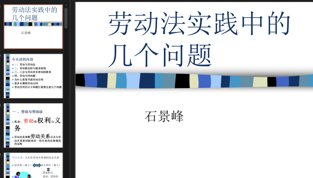 石景峰副教授多年来从事商法、劳动法、社会保障法的教学和研究工作,经验丰富,教学成果丰硕。石老师从劳动宣传月设置的目的和意义讲起,结合自身经历为同学们讲授参与劳动的必要性。解释了劳动与劳动法的关系,告诉同学们在未来的工作和社会实践中可以运用法律来保护自己。石老师通过案例展示的方式,围绕就业歧视问题、参与工会以及劳动合同的订立与履行等具体问题,为同学们讲述了在劳动当中应当如何行使权利和履行义务,在面对不平等待遇和劳动争议时,可以通过适用劳动法的相关规定来确保自己的合法权益免受侵害。