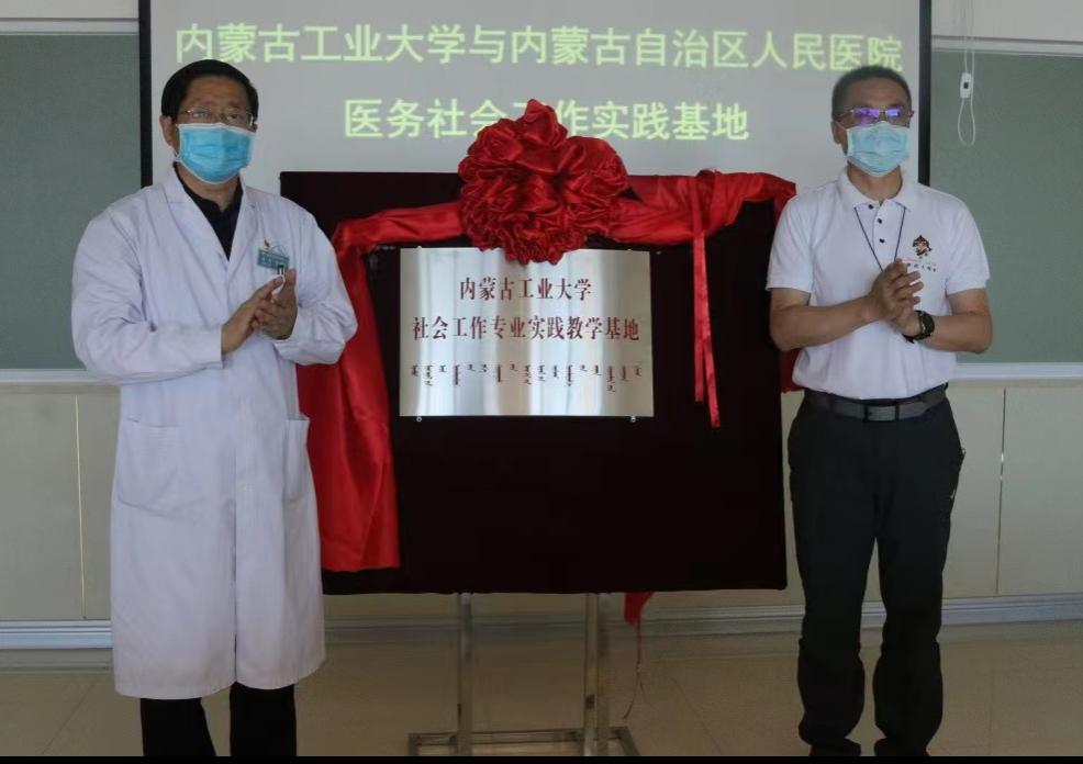 仪式上,袁军介绍了内蒙古自治区人民医院总体情况,并就共同培养医务社工专业人才、构建和谐医患关系、改善就医体验、推动区内医务社会工作发展等方面提出诸多期待。文宗川结合我区当前对服务业发展的要求和专业技术服务人员的需求等,倡导双方在教学、科研、实习实践、案例共享中心平台建设等诸多方面开展合作,提升人才培养质量。袁军与文宗川代表双方签订实践教学基地合作协议。