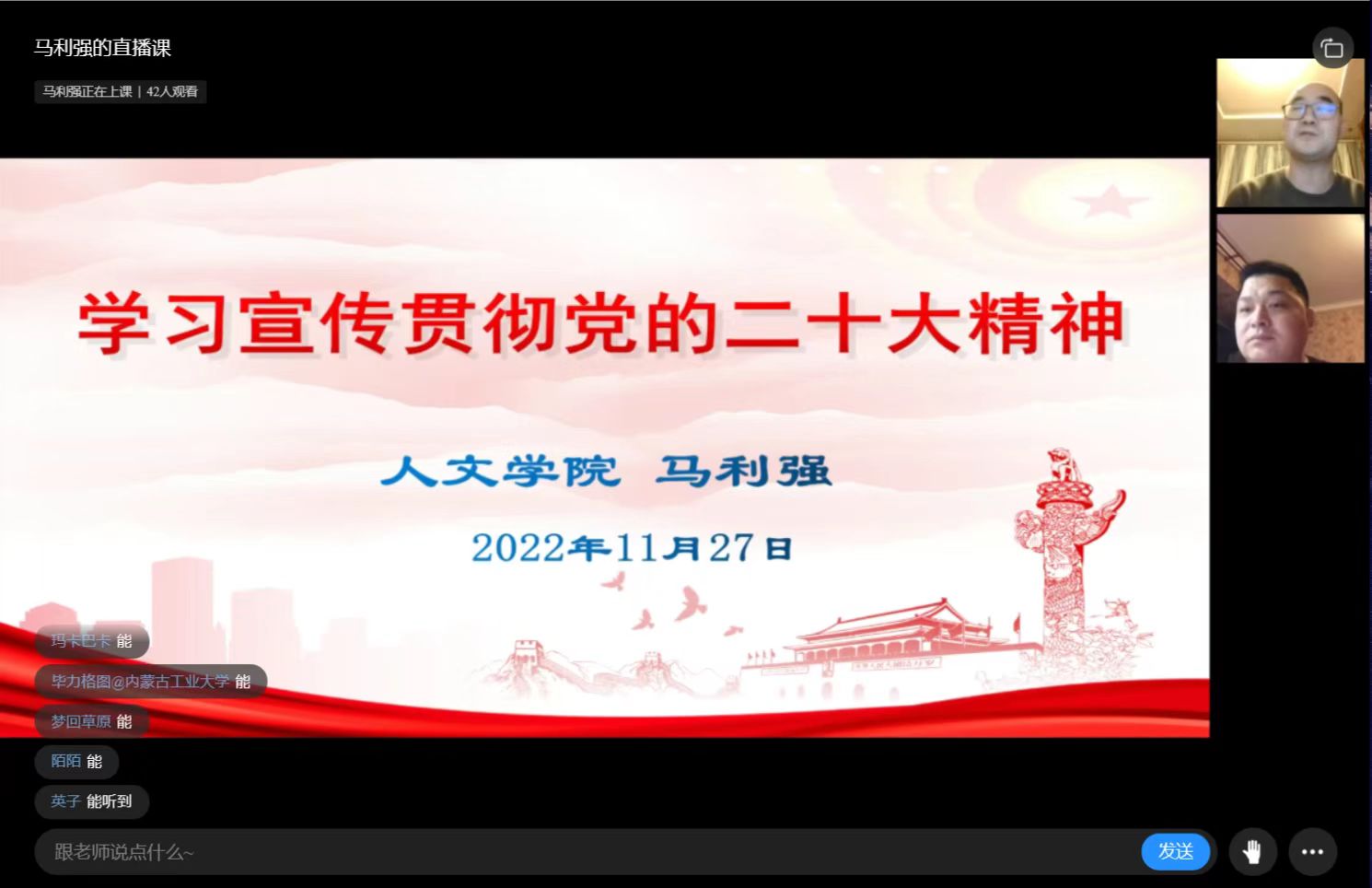 11月27日至12月1日,yl6776永利集团举办学习宣传贯彻党的二十大精神专题读书班。学院党委书记马利强,院长、党委副书记郝晓燕,党委副书记、副院长武新春,学校党的二十大精神宣讲团成员马立国教授分别做主题宣讲。学院全体教师、学生党员、发展对象和入党积极分子参加。