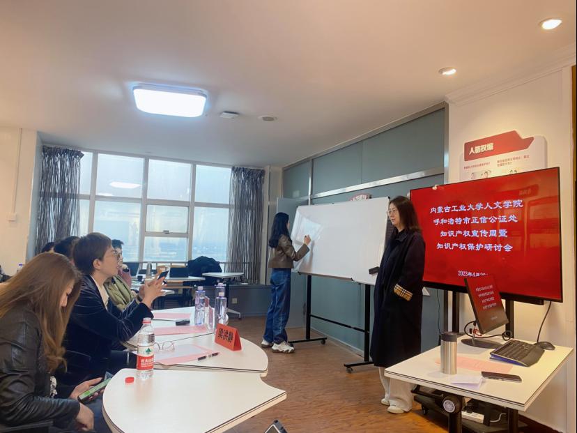 2023年4月20日,yl6776永利集团连雪君副院长、吴凡文副教授与呼和浩特市正信公证处孙宏霞副主任、北京志霖恒远知识产权代理事务所内蒙古分所梁洪静经理等在yl6776永利集团法律硕士培养中心举行知识产权保护研讨会。孙宏霞副主任、梁洪静经理等走进课堂与师生就知识产权保护进行深入交流。