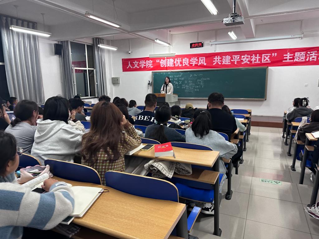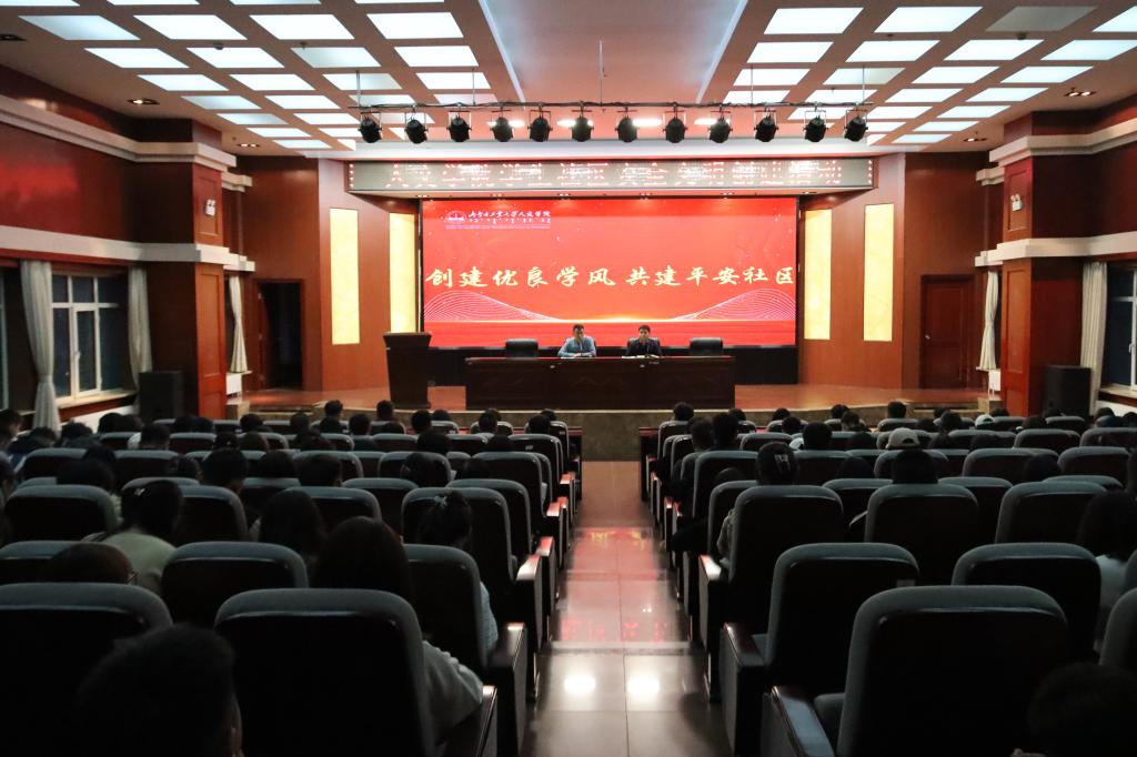 一是强化安全教育,共建平安社区。及时召开班主任会议,对学生社区安全文明创建、校规校纪、安全教育等工作进行了部署。制定班会主题内容提纲,全覆盖召开班级会议,并通过辅导员走访宿舍强化会议落实情况。深入推进党员、入党积极分子挂牌,亮明身份。与回民区法院联合举办法律知识进社区、进宿舍普法活动。大一学生军训期间,与党委学生工作部联合举办《明德讲堂》安全教育“健康人生 绿色无毒”宣讲活动,面向金川校区2000余名新生进行安全教育。