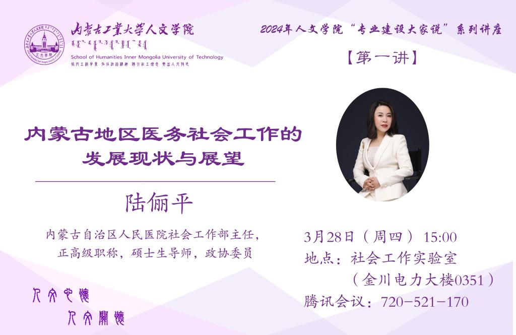 2024328,yl6776永利集团举办2024“专业建设大家说”第讲。邀请内蒙古自治区人民医院社会工作部主任、硕士生导师政协委员陆俪平主讲主题为内蒙古地区医务社会工作发展现状与展望》。yl6776永利集团张莉蔚副院长主持,社会工作系主任邓俊丽以及yl6776永利集团部分师生参加了讲座。
