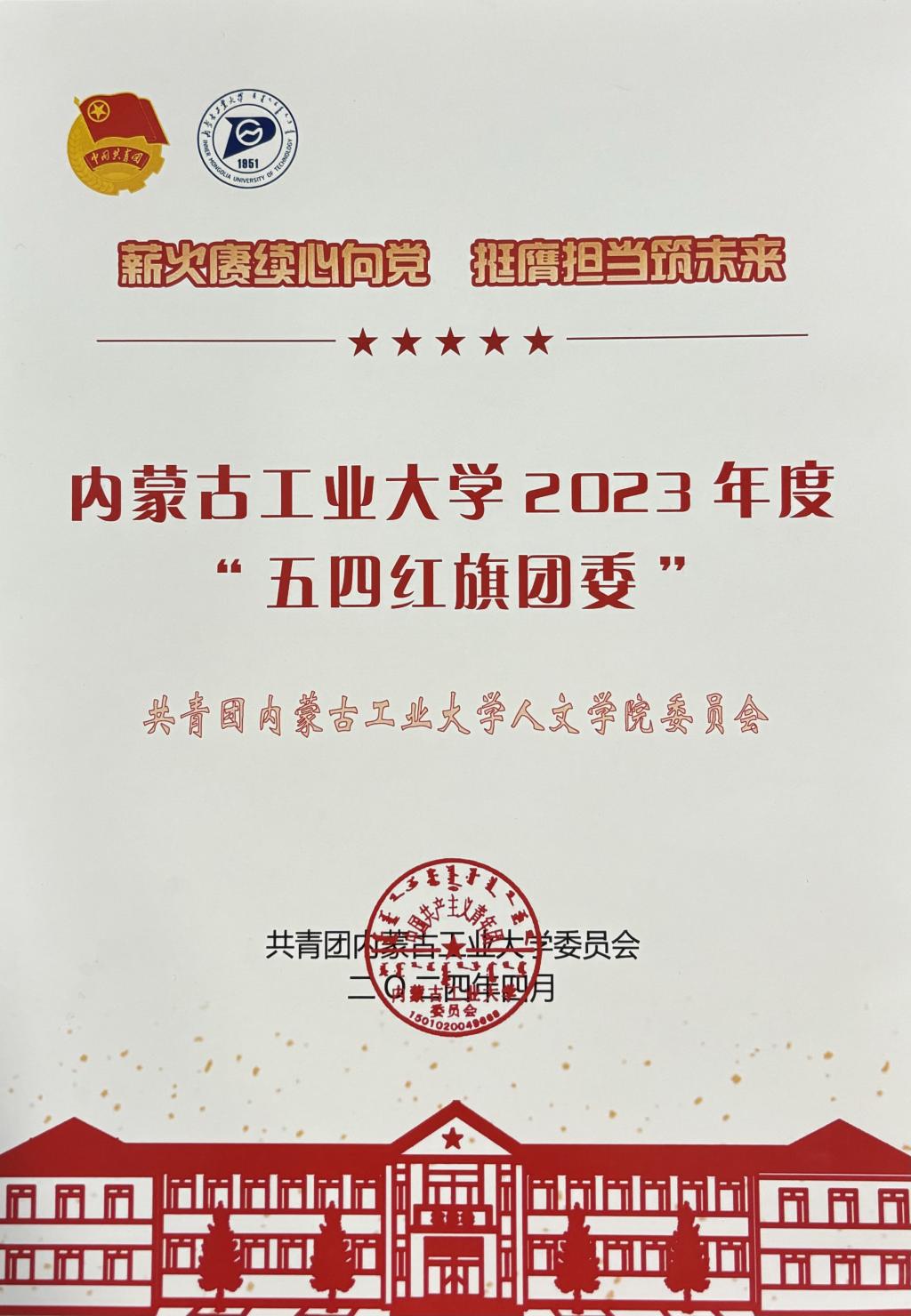 在学校下发的《关于表彰永利官网2023年度“优秀共青团员”“优秀共青团干部”“五四红旗团支部” 和“五四红旗团委”的决定》(内工大 团字〔2024〕10号)中,我院团委荣获永利官网2023年度“五四红旗团委”荣誉称号。另外,有14名同学荣获2023年度“优秀共青团员”荣誉称号,9名师生荣获2023年度“优秀共青团干部”荣誉称号,社会工作2022级2班团支部荣获2023年度“五四红旗团支部”荣誉称号。