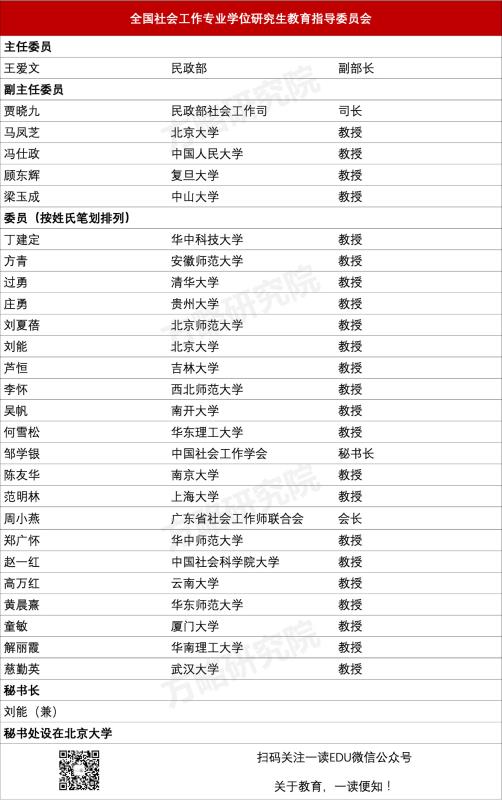 其中,涉及我院社会工作专业的全国社会工作专业学位研究生教育指导委员会换届了,秘书处设在北京大学。委员名单如下:
