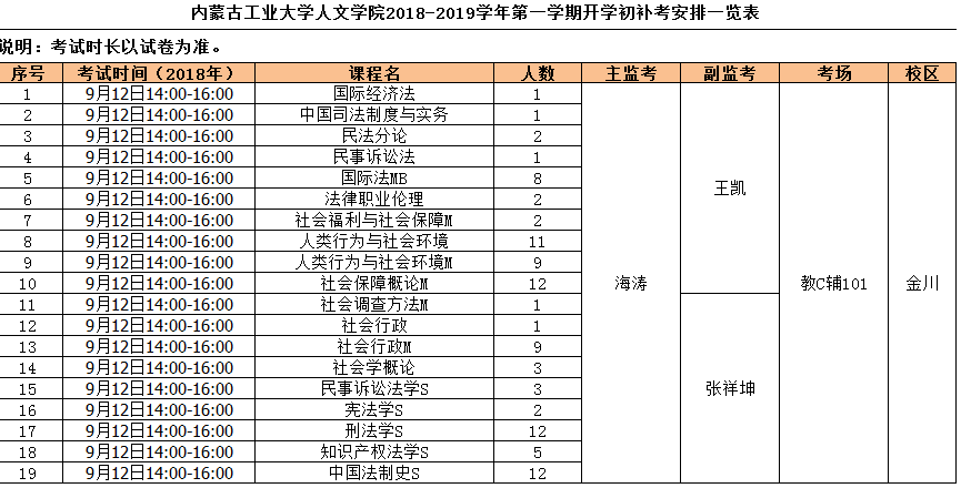 yl6776永利集团2018-2019学年第一学期开学初补考安排一览表