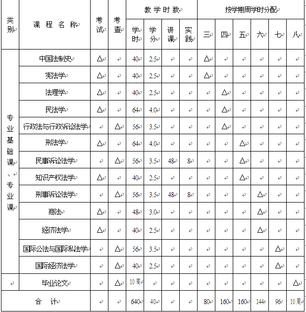6、课程设置:法学专业双学士学位课程共计13门。总计640学时,40学分。详见教学计划。