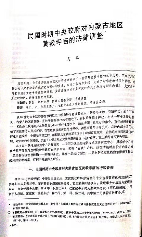 《民国时期中央政府对内蒙古地区黄教寺庙的法律调整》一文,以法学与宗教学、蒙古学的交叉学科视野,首次对民国时期北京政府和国民政府时期中央政府对内蒙古地区黄教的法律调整进行了严谨、详细的考证。该论文丰富了蒙古史的研究成果,填补了该领域的空白。