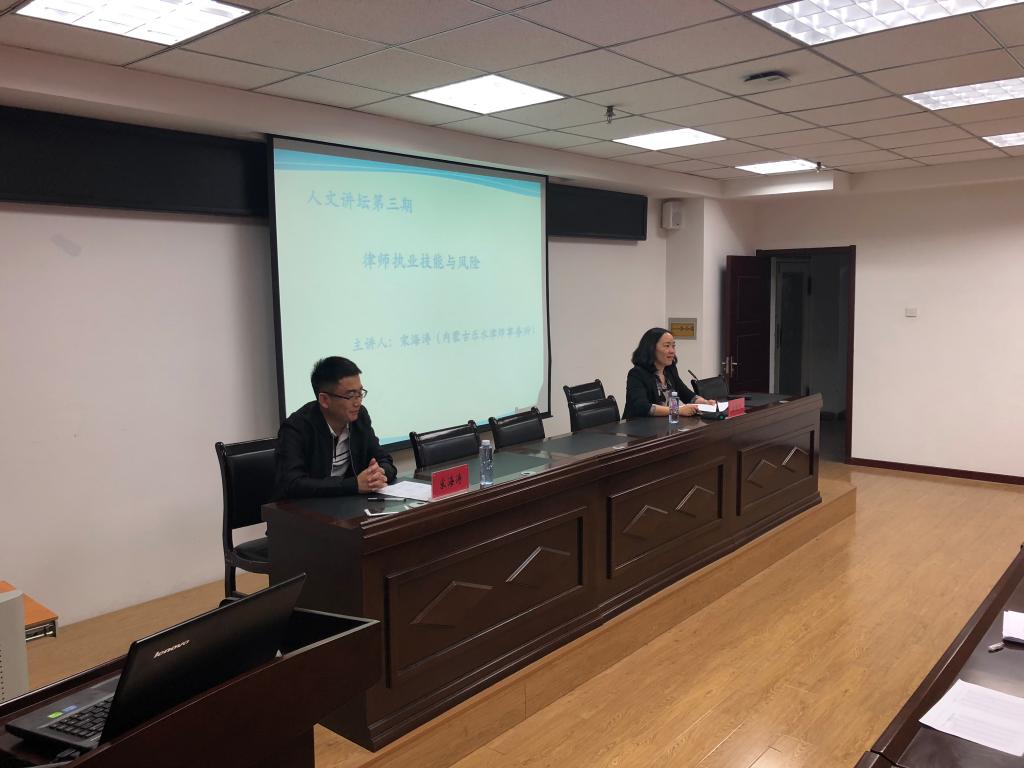 为进一步提升法学专业学生的实务能力,创新法学专业实践教学形式,人文讲坛第三期于2018年5月10日在电力大楼402举行。邀请内蒙古乐水律师事务所合伙人宋海涛做题为“律师执业技能与风险”的讲座。法学专业高年级学生及部分教师共120人参加讲座,副院长苏丽娜主持。