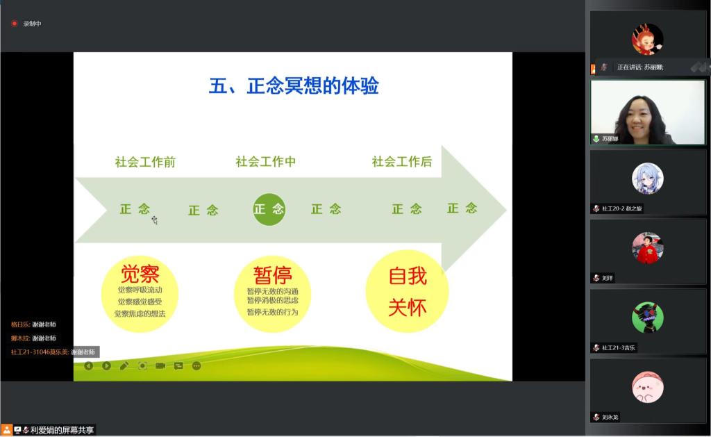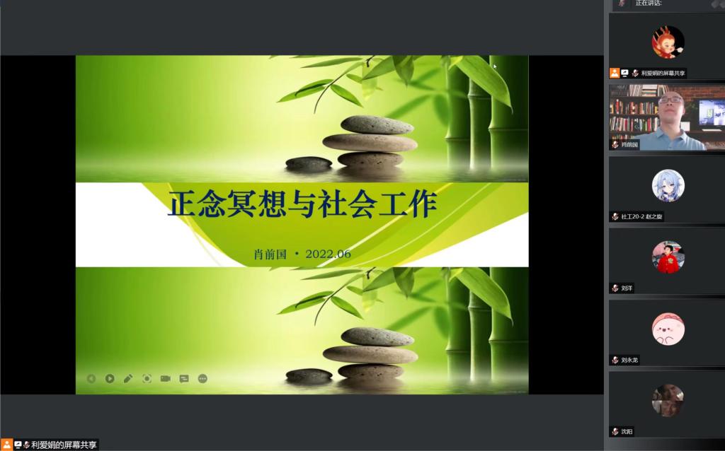6月9日下午,yl6776永利集团于线上举办“人文讲坛”第三讲。邀请重庆文理学院副教授、国内知名正念研究专家肖前国副教授通过在线平台做“正念冥想与社会工作”专题讲座,学院部分教师、社会工作专业本科生以及MSW研究生在线参加,副院长苏丽娜主持。