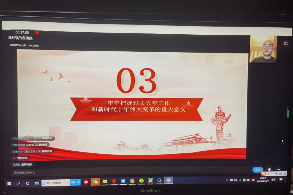 开班式后,马利强做了专题宣讲,从深刻领会党的二十大的重大意义、深刻领会大会的主题、牢牢把握过去五年工作和新时代十年伟大变革的重大意义、牢牢把握习近平新时代中国特色社会主义思想的世界观和方法论和推动党的二十大精神在学院落地生根等九个方面对党的二十大的重大意义、深化内涵和在学院工作中的具体落实做了深入宣讲。