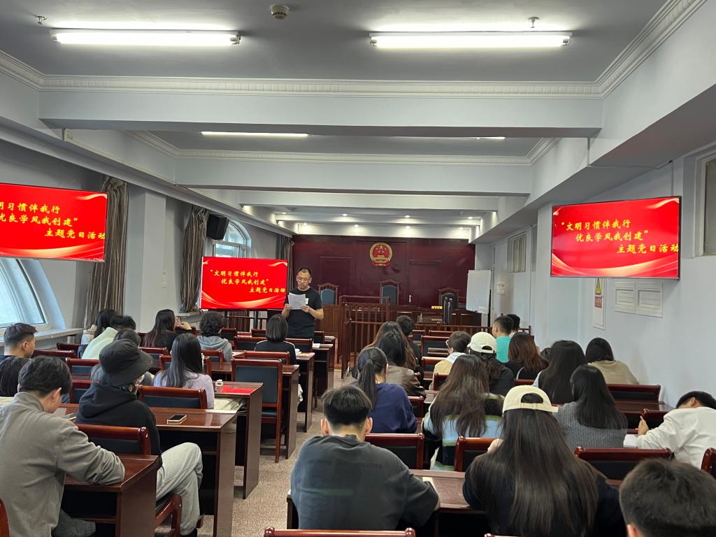 10月24日,yl6776永利集团党委在模拟法庭开展“文明习惯伴我行 优良学风我创建”主题党日活动,在校全体学生党员参加,学院党委专职组织员孔德豪主持活动。