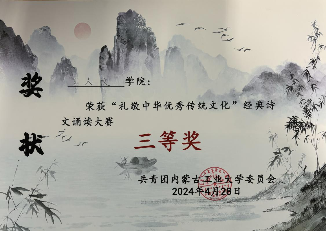为了弘扬中华优秀传统文化,传承中华传统美德,提高大学生的文化和道德修养4月28日,我校举办“礼敬中华优秀传统文化”经典诗文诵读大赛我院荣获三等奖。