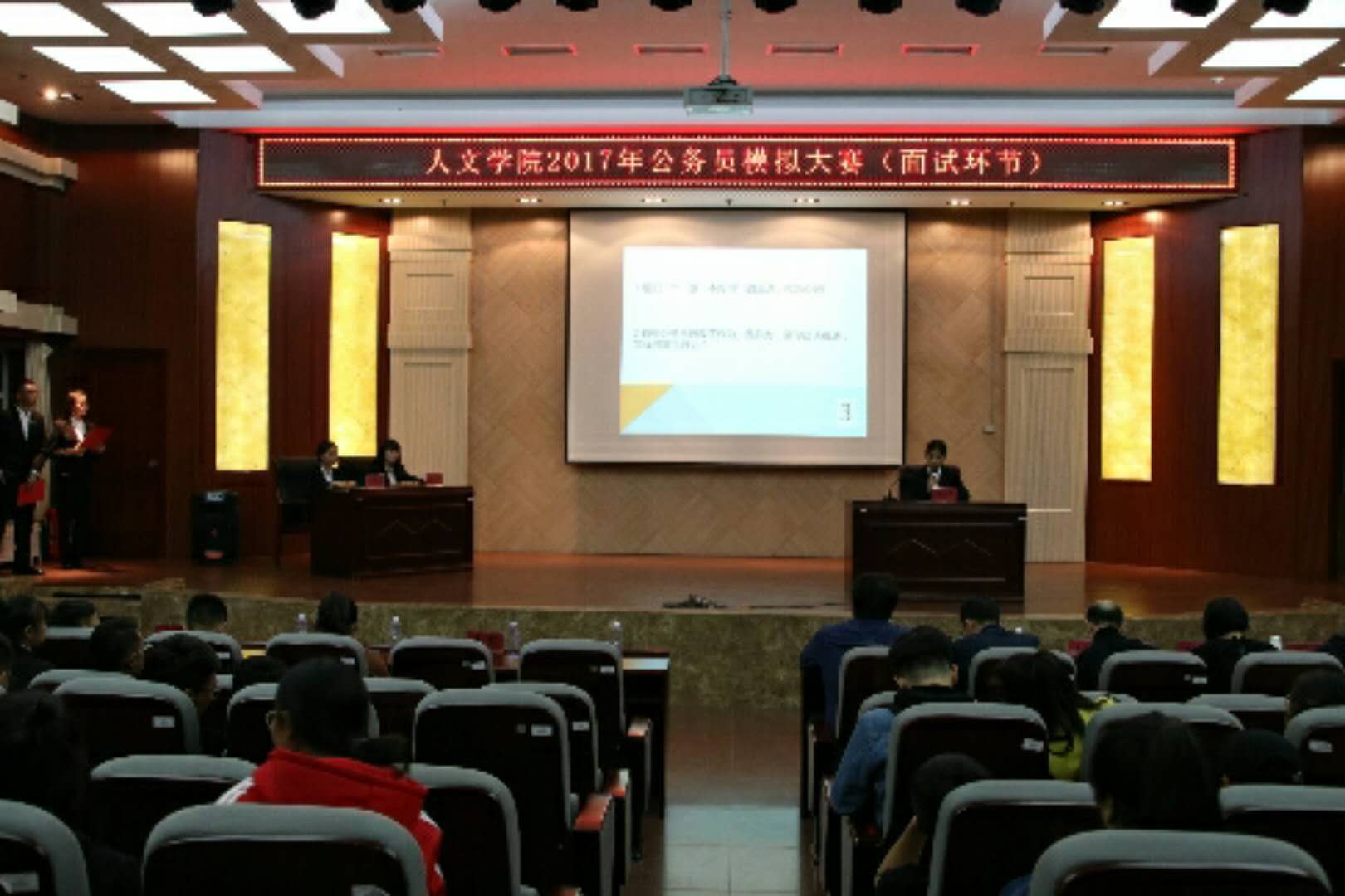 1027日晚,yl6776永利集团2017年公务员模拟大赛决赛在金川电力大楼十楼报告厅举行。yl6776永利集团党总支书记马利强,党总支书副书记、副院长毛长明,团总支书记白南定,学工办主任陈槟颖,就业办主任王凯担任考官。本次比赛采用公务员招考的结构化面试形式。
