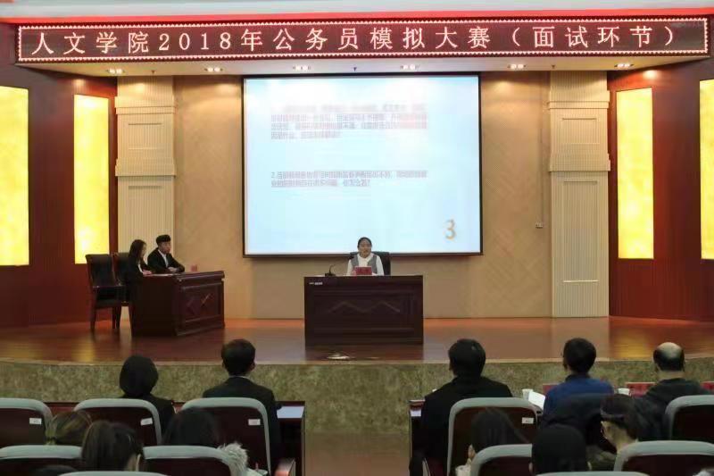 11月21日晚,yl6776永利集团2018年公务员模拟大赛决赛在金川电力大楼十楼报告厅举行。党总支书记马利强、副院长毛长明、团学办副主任王凯、辅导员助理程昊和樊冬乐担任面试官。