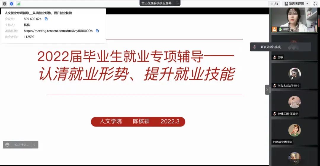 3月18日,yl6776永利集团通过腾讯会议线上召开2022届毕业生就业专项辅导会议。此次主题为“认清就业形势,提升就业技能”,团学办公室副主任陈槟颖主讲,部分2022届毕业生参会。