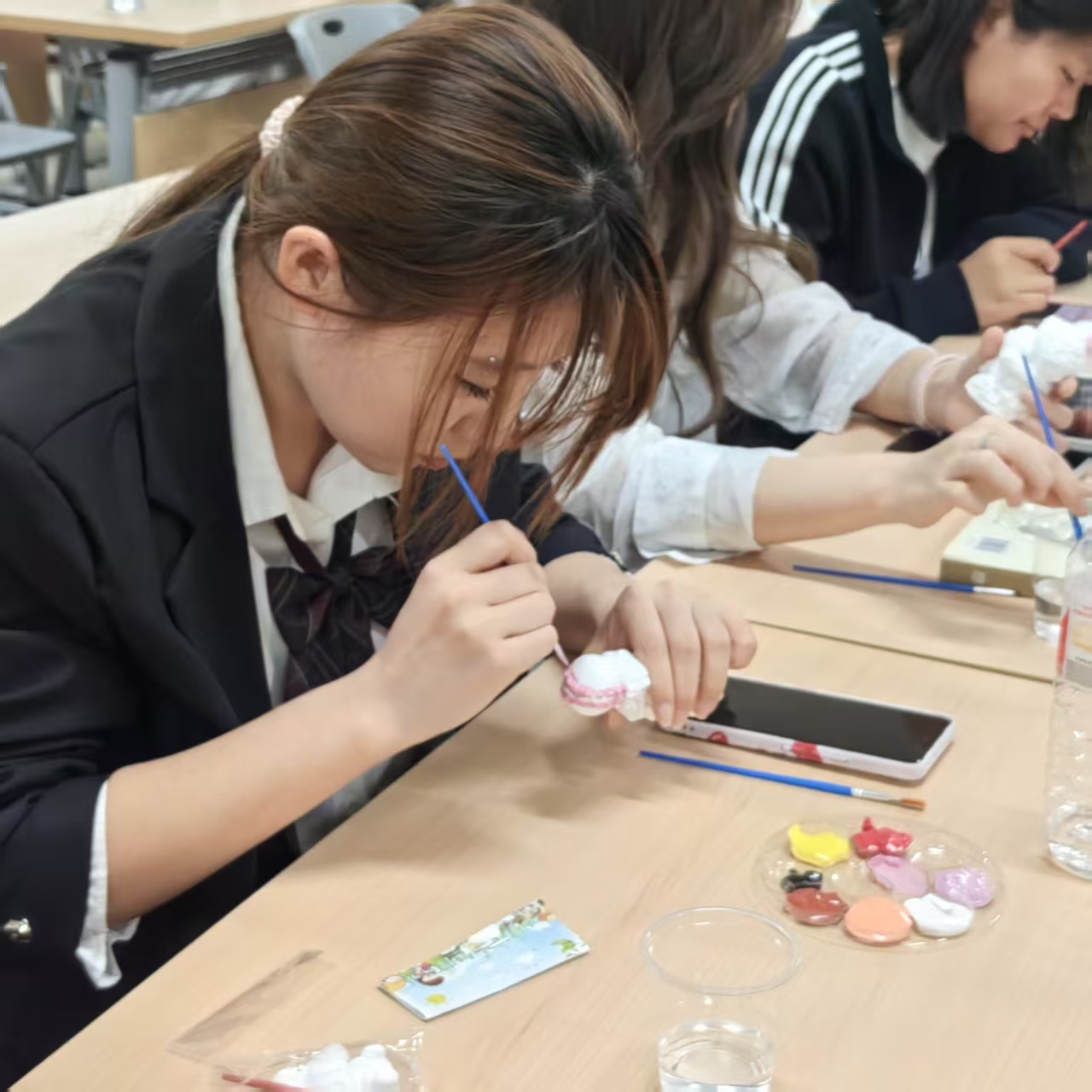 本次活动以“绘画是内心世界的投射”为理念,鼓励学生通过色彩表达情感,在自由创作中放松身心。同学们或专注独立绘制,或与同伴交流灵感,用画笔为素白的石膏注入个性与温度。有的为小熊添上星空披风,寓意“心怀浪漫宇宙”;有的将小兔涂成暖黄色,写下“成为自己的太阳”;还有同学尝试大胆撞色,展现对多元自我的探索。心理部成员全程引导互动,通过轻松话题帮助学生在创作中觉察情绪、梳理思绪。活动尾声,参与者们带着亲手绘制的作品和愉悦的心情离场。